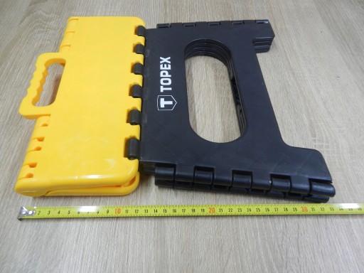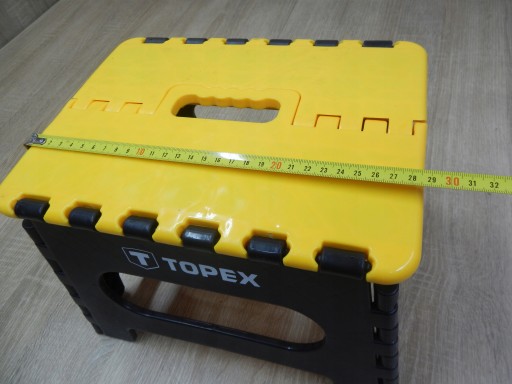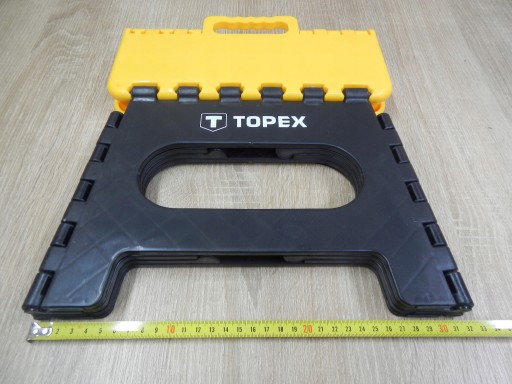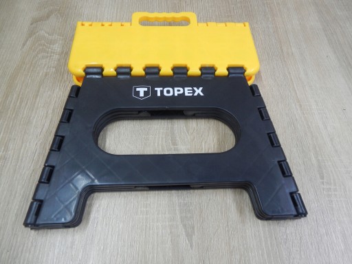 Stołek składany o udźwigu 150 kg. Praktyczny i poręczny stołek składany o wysokości 22 cm, wykonany jest z wytrzymałego tworzywa sztucznego. Może być wykorzystywany jako podest. Posiada przemyślany mechanizm składania, dzięki czemu jest stabilny i bezpieczny w użyciu. Po złożeniu zajmuje niewielką ilość miejsca. Marka TOPEX skierowana jest do majsterkowiczów.