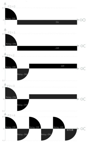 - Tryb P2.5 Po pojawieniu się napięcia zasilania przekaźnik zostaje włączony i odliczany jest czas T1 , po jego odliczeniu następuje wyłączenie przekaźnika i odliczanie czasu T2, gdy czas T2 zostanie odliczony przekaźnik włącza się.Cykl powtarza się w nieskończoność.