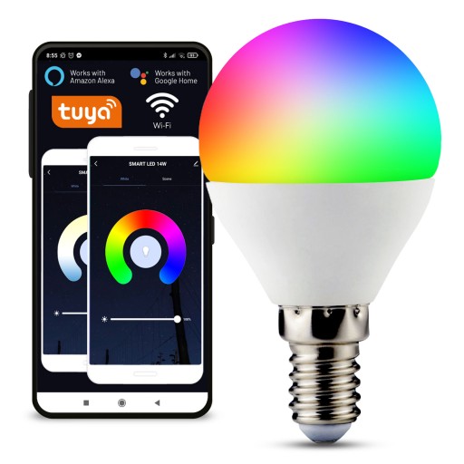 Inteligentna żarówka LED WIFI RGB+W 5,5W, Trzonek E14, 2700K-6500K, Tuya GOOGLE ALEXA