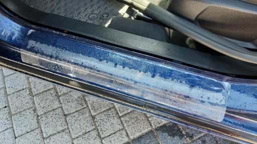 Poniżej przedstawiamy fotorelację z wymiany folii na progu własnego auta. Folia po prawie 1,5 roku intensywnego użytkowania (przez brudne buty 7 i 4 latka samodzielnie wsiadającego i wysiadającego z auta) doczekała się wymiany. Folia nie została w żadnym miejscu przerwana, wymiana została podyktowana wyłącznie względami estetycznymi oraz chęcią zaprezentowania właściwości folii. Trzecie zdjęcie bez folii przedstawia próg auta, na które przez 7 lat folia nie była naklejona, są więc małe zarysowania które powstały przed pierwszą aplikacją folii.