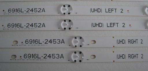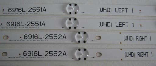 Oryginalne podświetlanie matrycy / listwy LED LG 6916L-2452A / 6916L-2453A / 6916L-2551A / 6916L-2552A / 49" V16 ART3 2452 | 2453 | 2551 |2552 Rev 3.2 2 . Listwy stosowane w wielu modelach telewizorów LG w rozmiarze 49 cali. Listwy NOWE, 100% sprawne i oryginalne, na laminacie. Dodatkowo wszystkie paski podklejone są specjalna taśmą termo-przepuszczalna firmy 3M żeby dobrze dolegały do obudowy i odprowadzały ciepło.