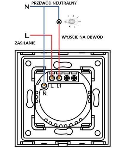 Do prawidłowego oraz bezpiecznego działania włącznika, należy podłączyć go za pomocą przewodu L (zasilanie 230V) oraz N (wejście neutralne). Natomiast wyjście na kanały (odbiorniki, światło, np. lampy itp.) należy wpiąć odpowiednio przy włączniku pojedynczym L1, a w przypadku podłączenia włącznika podwójnego L1 oraz L2.