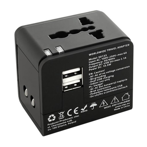 Adapter podróżny Qoltec został wyprodukowany z materiałów najwyższej jakości, aby zapewnić Ci niezawodne zasilanie w każdej sytuacji. Dzięki wbudowanym gniazdom USB możesz jednocześnie podłączyć dwa urządzenia dzięki czemu szybko i sprawnie dostarczysz energię swoim urządzeniom. Z naszym adapterem zaoszczędzisz sporo miejsca w walizce - niewielkie rozmiary urządzenia pozwolą Ci zabrać go w wiele miejsc na świecie gwarantując bezpieczne zasilanie.