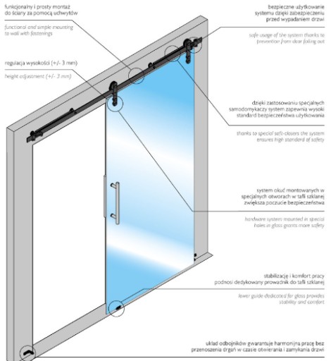 Loft Glass to system do wewnętrznych drzwi szklanych przesuwnych, nadający lekkość minimalistycznym i surowym wnętrzom. Proste wzornictwo okuć zapewnia nowoczesny wygląd.