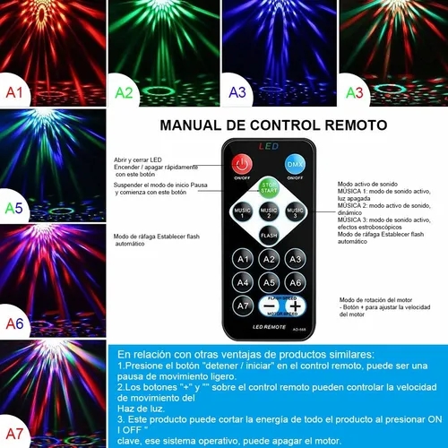 1. Wielofunkcyjne światło dyskotekowe: 3 tryby aktywacji dźwiękiem + 7 trybów oświetlenia + lampa błyskowa + kontrola prędkości obrotowej + kontrola prędkości błysku.