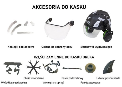 Do kasku można zamontować osłonę do ochrony oczu i słuchawki wygłuszające oraz nakleić odblaskowe naklejki dedykowane do tego modelu.