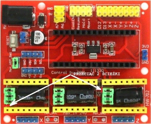 Otóż na płytce znajdują się sloty ( piny ) na zworki na których ustawia się kroki jakie musi wykonać silnik krokowy. Obecna elektronika w tym A4899 pozwala na uzyskanie 1/2 kroku, 1/4 , 1/8 i 1/16 kroku. Są to tzw. mikrokroki. Bez możliwości ich wykorzystania drukarka i maszyna CNC, czy laser miałby kiepską rozdzielczość. To tak jak zdjęcie wykonane w rozdzielczości 1 Mpx jest gorsze od 16 Mpx. Silniki Nema 17 posiadają 200 kroków/ 1 obrót wału przy Full Stepie, ale przy 1/16 mają już 3200 mikrokroków - jest różnica co?! Otóż te piny na płytkach są zwarte do masy, a powinny być podpięte do napięcia +5V, co wiąże się z koniecznością przecięcia kilku ścieżek i podpięcia ich do potencjału [+5] .