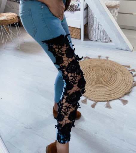 SPODNIE JEANSOWE MODNE Z KORONKĄ WSTAWKI L