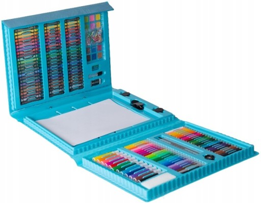Komplet do malowania i rysowania umieszczony został w dedykowanym etui – plastikowej walizce. Składa się ona na trzy części. Boczne to wytłaczane przegródki na kredki, flamastry, farby i akcesoria.