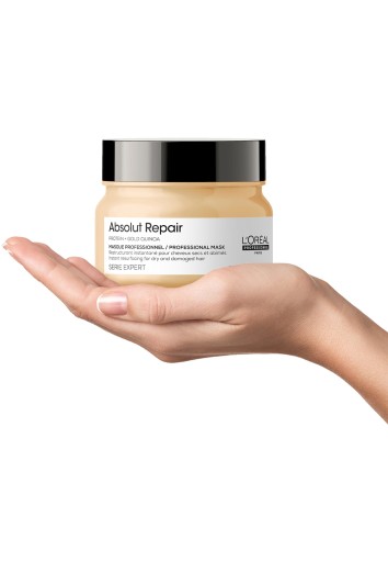 Profesjonalna formuła maski Absolut Repair Gold Quinoa wzbogacona o ekstrakt ze złotych otrębów komosy ryżowej i białko pszeniczne. Włosy wydają się miękkie i pełne blasku, a ich gładkość jest natychmiast przywrócona.