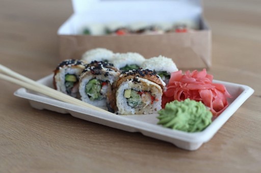 Biodegradowalne pudełka na sushi wykonane z pulpy z trzciny cukrowej. Posiadają pokrywkę z rPET.