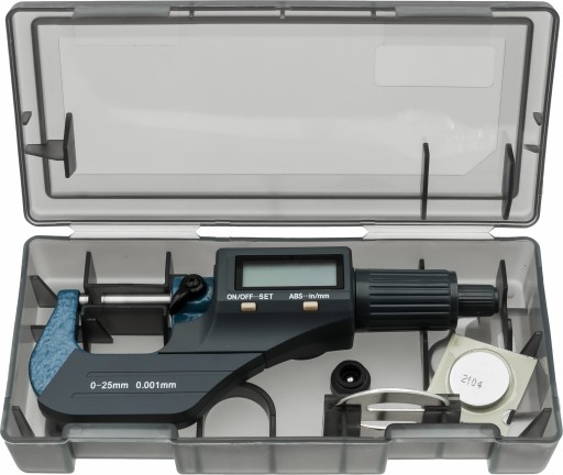 Precyzyjny mikrometr elektroniczny. Powszechnie wykorzystywany do precyzyjnego pomiaru niewielkich odległości w inżynierii mechanicznej i innych branżach mechanicznych. Jasny wyświetlacz LCD pozwala na łatwy odczyt pomiaru. Przy korpusie znajduje się zacisk dźwigowy, ustalający położenie kowadełka. W skład zestawu wchodzi kulka stalowa w gumowym mocowaniu, umożliwiającym montaż na powierzchni pomiarowej mikrometru. Ułatwia ona pomiar elementów o małej powierzchni.