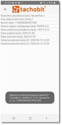 - Pogląd podstawowych danych o karcie kierowcy. (Nazwisko kierowcy, Imię kierowcy, Numer karty, Nazwa organu wydającego, Data urodzenia, Data wydania, Data ważności, Data ostatniego pobrania generacja pierwsza G1, Data ostatniego pobrania generacja druga G2)