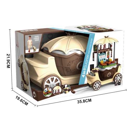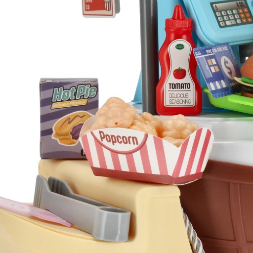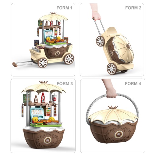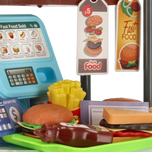 Przenośny sklep-stoisko fast-food w formie walizki, posiada kółka do przewożenia. Dziecko może przygotowywać i sprzedawać hamburgery, hot-dogi, frytki i przejechać ze swoim sklepem w dowolne miejsce ;).
