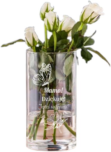 Aukcja dotyczy eleganckiego wazonu na kwiaty. Wazon okrągły w podstawie ozdobiony jest grawerem z jednej strony. Zdobienie grawerem laserowym zapewnia trwałe, dokładne oraz subtelne odwzorowanie znaku graficznego na szkle/drewnie. W ten sposób możemy umieścić Twój pomysł, grafikę, wzorek, logo, tekst na wazonie, który niewątpliwie przyciągnie uwagę domowników czy znajomych podczas spotkania. Szkło ręcznie formowane przez co mogą zdarzyć się drobne bąbelki powietrza które w niczym nie przeszkadzają
