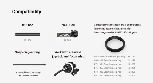 SmallRig Mini Follow Focus 3010 is designed for easy and quick focus control in video shooting.It is fixed to the left side of the lens via Φ15mm Rod 1050 and Rod Clamp (with NATO rail) 3011.The quick-release Tie-style Focus Gear Ring 3284 fits lens of various diameters and drives lens through standard 0.8 MOD gears with different numbers of teeth, comes with M0.8-43T gear 3201.Gear optional model: M0.8-65T gear 3200, M0.8-38T gear 3285; rod clamp (with NATO rail) 3011 supports quick release interface.The marking ring can be easily removed and replaced.The AB marks are adjustable for easy switch between AB focal length and full focal length.Lightweight and portable, the follow focus features anti-sweat and anti-slip focus knob (imitating sports car hub), providing precision comfortable dampening control.Can be mounted at different angles, providing precise adjustment and convenient shooting experience in handheld and tripod scenarios.
