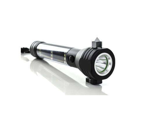 Na głowicy latarki umieszczony został również wybijak do szyb. Jedno uderzenie wystarczy, aby szkło hartowane szyby zbiło się w drobny piach i udostępniło drogę ewakuacji z pojazdu!