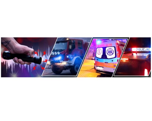 Latarka posiada wbudowane sygnały świetlne. Aby uruchomić czerwono-niebieskie koguty przytrzymaj przycisk zapalania latarki i nie zwalniaj go do momentu zapalenia się kogutów!