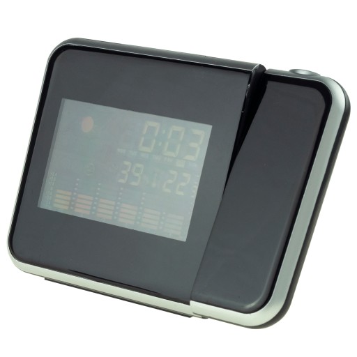 Cyfrowa stacja pogody z zegarkiem, budzikiem, kalendarzem oraz z wbudowanym laserowym projektorem godziny. Urządzenie posiada duży i czytelny, kolorowy wyświetlacz LCD o przekątnej 3,7'', na którym wskazywany jest pomiar temperatury wewnętrznej w stopniach Celsjusza lub Fahrenheita, wilgotności powietrza w % oraz aktualnej i przewidywanej prognozy pogody. Wbudowany, regulowany projektor umożliwia odczyt godziny nawet w całkowitych ciemnościach. Urządzenie bardzo przydatne, swoim wyglądem z pewnością stanowi ozdobę.