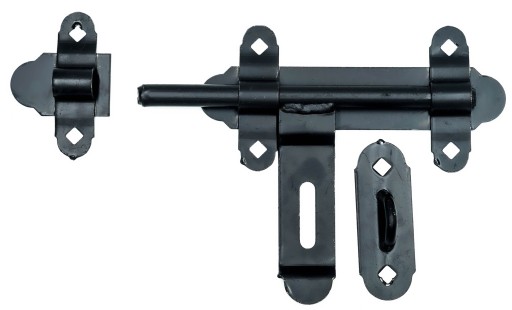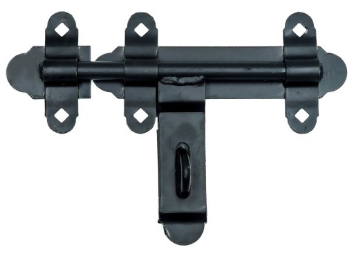 Zasuwka GARAŻOWA wykonana z grubej blachy malowanej na czarno. Bolec zamykający 16 mm. Rygiel dodatkowo posiada funkcje zamknięcia na kłódkę.