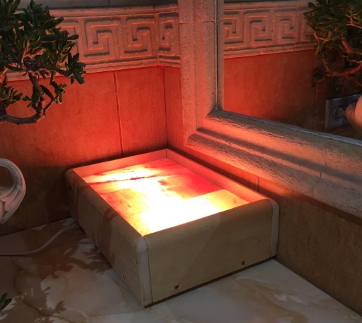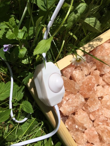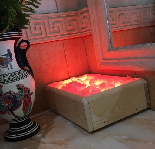 Lampa z góry ma warstwę bryłek solnych kłodawskich, pod spodem warstwa cegieł ze soli himalajskiej, na dole podgrzewana żarówkami 3sztuki .Lampa posiada płynną regulację natężenia światła, co pozwala kontrolować temperaturę cegieł i bryłek solnych.