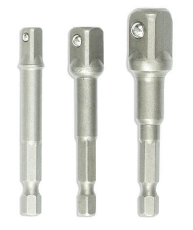 Zestaw 3 szt. adapterów do nasadek o rozmiarze trzpienia 1/2", 1/4" oraz 3/8". Adaptery przystosowane są do pracy z wiertarko-wkrętarkami, wiertarkami oraz zakrętarkami. Adaptery wykonane z wytrzymałej stali chromowo wanadowej, która gwarantuje odpowiednią trwałość i odporność na korozje.