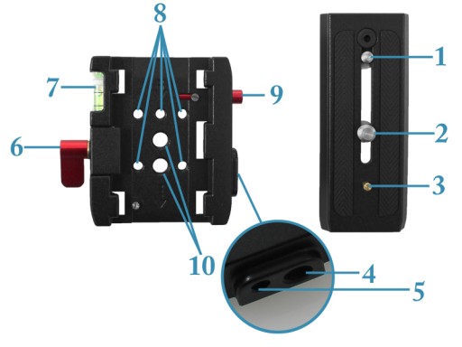 Pozwala na szybkie zdjęcie kamery lub lustrzanki z głowicy, bez odkręcania od płytki mocującej i założenie jej na inną głowicę, posiada gwintowane otwory montażowe 1/4" oraz 3/8". Adapter dodatkowo posiada blokadę zabezpieczającą przed wysunięciem oraz dwie poziomnice.