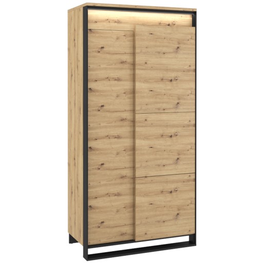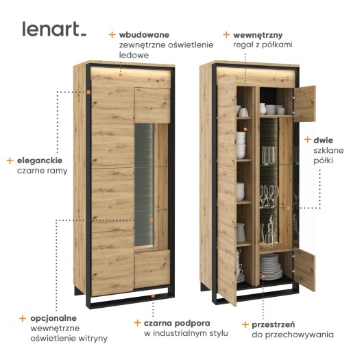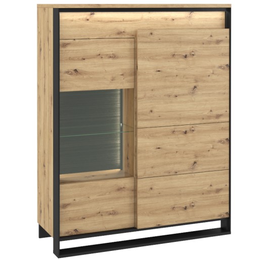 Wysoka witryna w nowoczesnym, loftowym stylu. Smukła, czarna podpora oraz ciekawy dekor podkreślają nowoczesny styl mebla. Funkcjonalny podział wnętrza pozwala niektóre przedmioty schować, a inne ciekawie wyeksponować. W lewej części mebla znajdziesz zamykany regał z półkami. Prawa strona została podzielona na strefę z przeszkleniem oraz część z dwoma szafkami. Witryna posiada dwa rodzaje oświetlenia ledowego – zewnętrzne podkreślające przestrzenny charakter frontów (dostępne w komplecie) oraz wewnętrze, umieszczone w części przeszklonej (dostępne w opcji dodatkowej). Witrynę wykonano z wytrzymałej płyty laminowanej wykończonej trwałym obrzeżem ABS. Komfortowe użytkowanie wspomaga mechanizm PUSH TO OPEN.