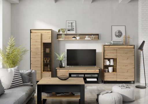 Niska witryna w nowoczesnym, loftowym stylu. Funkcjonalny podział wnętrza pozwala niektóre przedmioty schować, a inne ciekawie wyeksponować. W prawej części mebla znajdziesz zamykany regał z półkami. Lewa strona została podzielona na strefę z przeszkleniem oraz część z dwoma szafkami. Witryna posiada dwa rodzaje oświetlenia ledowego – zewnętrzne podkreślające przestrzenny charakter frontów (dostępne w komplecie) oraz wewnętrze, umieszczone w części przeszklonej (dostępne w opcji dodatkowej). Smukłe, czarne podpory oraz ciekawy dekor podkreślają nowoczesny styl mebla. Witrynę wykonano z wytrzymałej płyty laminowanej wykończonej trwałym obrzeżem ABS.