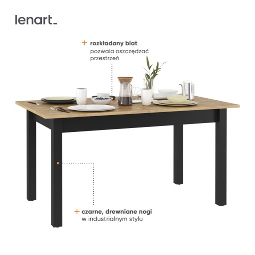 Elegancki, rozkładany stół w nowoczesnym stylu. Czarne, smukłe nogi w połączeniu z blatem imitującym naturalne drewno tworzą zestaw o niepowtarzalnym, loftowym charakterze. Złożony stół idealnie sprawdzi się podczas codziennych posiłków, natomiast rozłożony umożliwi spotkania w większym gronie. Mebel wykonano z wytrzymałej płyty laminowanej wykończonej trwałym obrzeżem ABS.