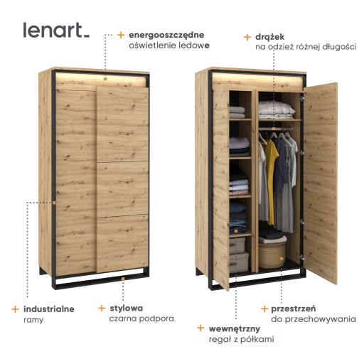Pojemna szafa dwudrzwiowa z drążkiem na wieszaki oraz wewnętrznym regałem z półkami. Funkcjonalny podział wnętrza szafy pozwala wygodnie rozmieścić garderobę i tekstylia, a na wieszakach zawiesić ubrania różnej długości. Szafę zaprojektowano w modnym, loftowym stylu. Ciekawy dekor o wyraźnym rysunku drewna znakomicie wygląda w towarzystwie czarnych detali. Trójwymiarowy charakter frontów został dodatkowo podkreślony przez ledowe oświetlenie. Szafę wykonano z wytrzymałej płyty laminowanej wykończonej trwałym obrzeżem ABS. Komfortowe użytkowanie wspomaga mechanizm PUSH TO OPEN.