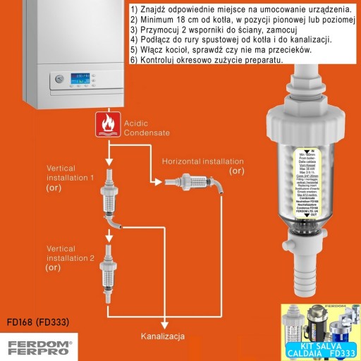 -FD168 montuje się na rurze odprowadzającej kondensat z kotła, chroni środowisko neutralizując potencjalnie szkodliwe odpady kwasowe, zanim trafią do kanalizacji.