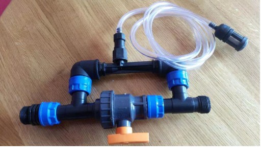 Aspirator - Napowietrzacz - Inżektor Jest urządzeniem do wprowadzania powietrza lub nawozów do przewodu wodociągowego, w którym płynie zażelaziona woda.Tlen zawarty w powietrzu utlenia związki Fe+2 do związków Fe+3, które są łatwe do usunięcia w różnego rodzaju filtrach. Jest to proste w użyciu urządzenie, które znakomicie sprawdza się w układach doprowadzających wodę studzienną do odżelaziaczy. Zaletą tego aspiratora jest wykonanie z plastiku, które zapobiega całkowicie korozji. Do aspiratora dołączony jest wężyk umożliwiający nie tylko zasysanie powietrza, ale także dozowanie różnego rodzaju nawozów.