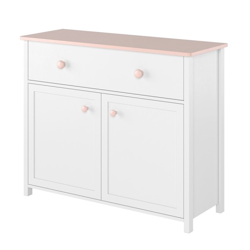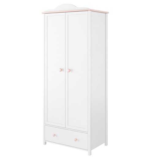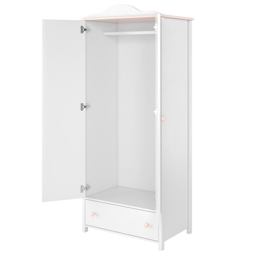 Dwudrzwiowa szafa na ubrania z drążkiem i pojemną łatwo dostępną szufladą. Bryła w kolorze alpejskiej bieli, różowe detale oraz oryginalne wykończenie z charakterystyczną miękką falą tworzą niepowtarzalny charakter mebla, który spodoba się mniejszym i większym romantyczkom. Mebel wykonano z wytrzymałej płyty laminowanej wykończonej trwałym obrzeżem ABS. Uchwyty z tworzywa.