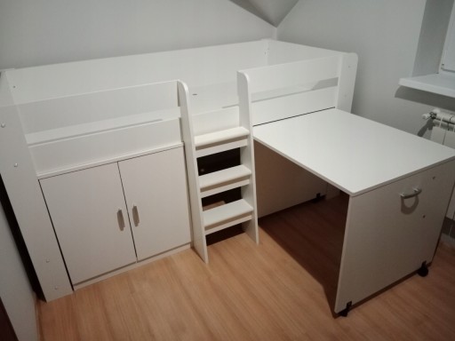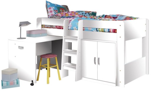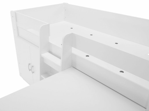 Mebel wykonany został z płyty laminowanej w kolorze białym. Łóżko wyposażone zostało w wysuwane biurko na kółkach oraz małą szafkę z dwojgiem drzwi. Zdecydowanie jego najważniejszą cechą jest uniwersalny montaż, biurko możemy montować zarówno po lewej jak i prawej stronie. Wejście znajduje się po środku i składa się z trzech stopni. Do łóżka nie jest wymagany stelaż, ponieważ zawiera ono już fabryczne dno pod materac.