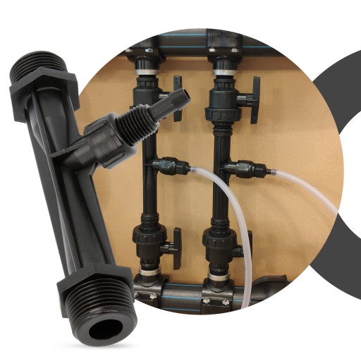Inżektor to prosty element służący do pobierania płynnego nawozu do instalacji nawadniającej. Działanie tego elementu opiera się na różnicy ciśnień, jaka powstaje pomiędzy wlotem i wylotem w momencie przepływu wody. Powstała siła ssąca przekłada się na pobór nawozu przez otwór znajdujący się pośrodku wtryskiwacza w miejscu zwężki.