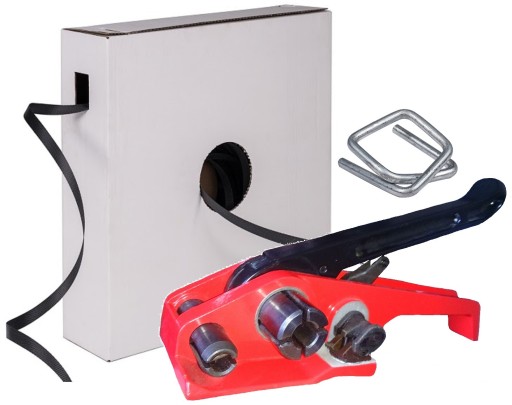 - Zestaw zawiera podstawowe akcesoria do spinania paczek, palet. Taśma jest łączona zapinką w prosty i szybki sposób. Zabezpieczenie jest solidne i najbardziej popularne wśród metod przewożonych towarów. Wytrzymałość można regulować ilością spięć.