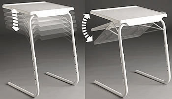 Wielofunkcyjny, lekki stolik do składania. Blat posiada regulowany kąt nachylenia pozwalający ustawić go w najwygodniejszej dla nas pozycji. Nóżki umożliwiają regulację wysokości. Całość można wygodnie złożyć.
