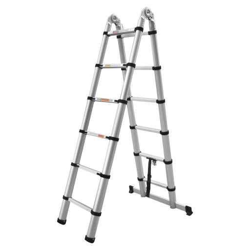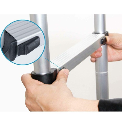 Drabina teleskopowa ma trwałą aluminiową konstrukcję, przemysłowe zatrzaski blokujące wysokość i solidne gumowe nóżki.