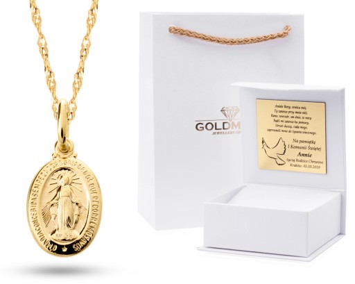 Złoty komplet, medalik z łańcuszkiem w całości wykonane ze złota próby 333. Zestaw idealnie nadaje się na takie okazje jak Chrzest Święty lub Komunia Święta. Dzięki bezpłatnemu grawerunkowi prezent stanie się jeszcze bardziej indywidualny. Biżuteria oferowana przez nas jest najwyższej jakości. Zdjęcia są naszego autorstwa, przedstawiają dokładnie ten produkt, który kupujesz! Do każdego zakupu otrzymasz gratis wybrane pudełko wraz z grawerunkiem. Możliwość wykonania dedykowanego napisu na wybranych medalikach.