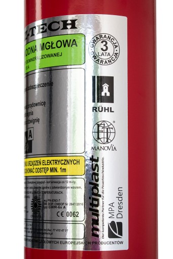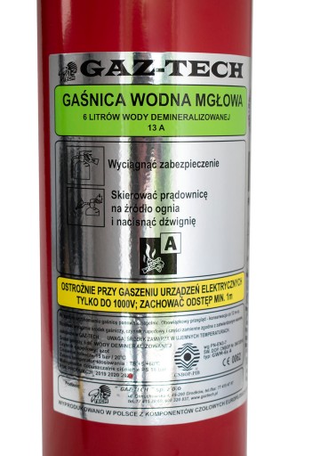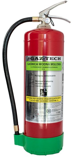 Gaśnica mgłowa (wodna) GWM-6x A przeznaczona jest do gaszenia pożarów w zarodku. Zalecana do zwalczania pożarów ciał stałych np. drewna, tworzyw sztucznych, tkanin itp.,