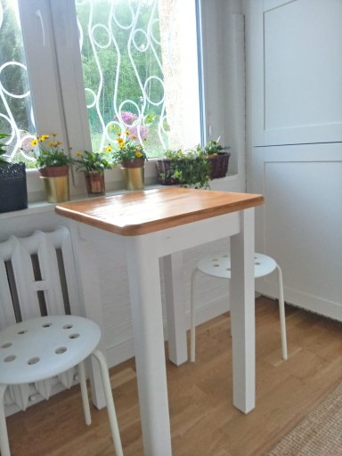 Stół jest solidnie wykonany, pokryty bejcą i białym lakierem;