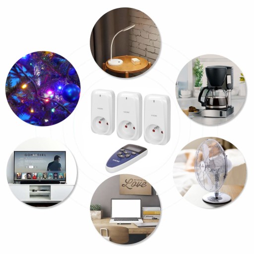 Zestaw trzech gniazd bezprzewodowych przeznaczonych do zdalnego włączania i wyłączania urządzeń elektrycznych za pomocą pilota znajdzie szerokie zastosowanie wewnątrz pomieszczeń do obsługi m. in.