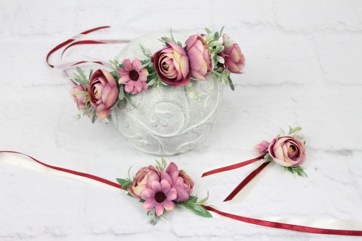Prześliczny i niebywale zwiewny wianek ślubny, pełen kwiatów peoni i rumianku w odcinaniach zgaszonego bordo, zdobiony dekoracyjnymi listkami bluszczu oraz traw.