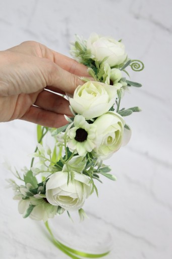 Prześliczny i niebywale zwiewny wianek ślubny, pełen kwiatów peoni i rumianku w odcinaniach kremu i zieleni, zdobiony dekoracyjnymi listkami bluszczu oraz traw.