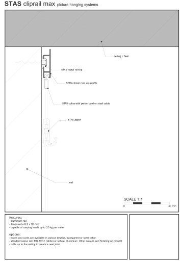Cliprail Max to szyna o wytrzymałości do 25 kg na metr bieżący systemu zawieszania. Dodatkowy kołnierz pozwala na zamontowanie szyny dokładnie przy samym suficie. Przy równych, płaskich sufitach daje to dużo elegancji. Szyna Cliprail Max oferowana jest w trzech kolorach: czarnym, białym i w kolorze naturalnego aluminium. Można ją łatwo przymocować do ściany za pomocą specjalnych klipsów dostarczanych w komplecie z szyną.