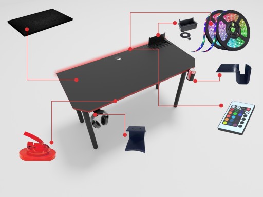 Przedmiotem oferty jest biurko gamingowe w kolorze czarnego blatu z czerwonym wykończeniem.