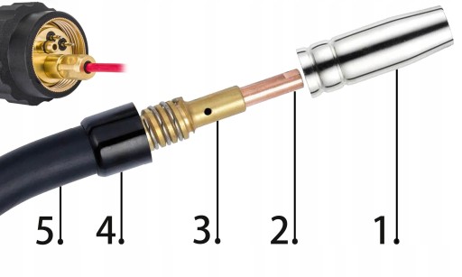 Zestaw podstawowych elementów niezbędnych do spawania aluminium metodą MIG/MAG uchwytem o standardzie MB 15.
