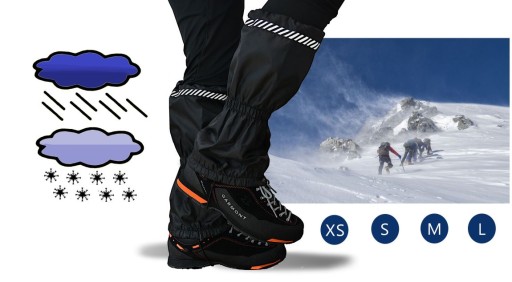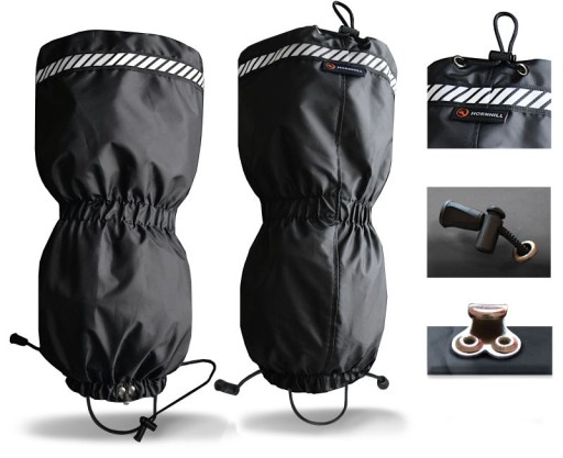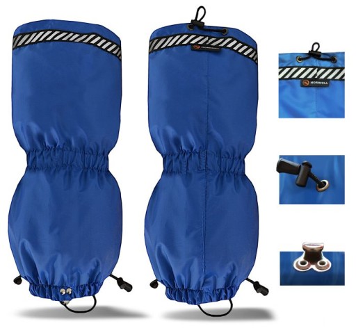 - Góra ochraniacza posiada sznurek z klipsem regulującym jego długość, dzięki czemu można szczelnie docisnąć materiał na nodze.