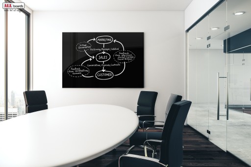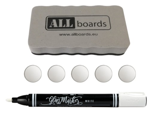 - Unikalna funkcjonalność - tablica ALLboards posiada wyjątkową cechę: pełni funkcję szklanej tablicy magnetycznej. Po tablicy można pisać markerami ścieralnymi oraz przypinać do niego rzeczy za pomocą magnesów neodymowych.